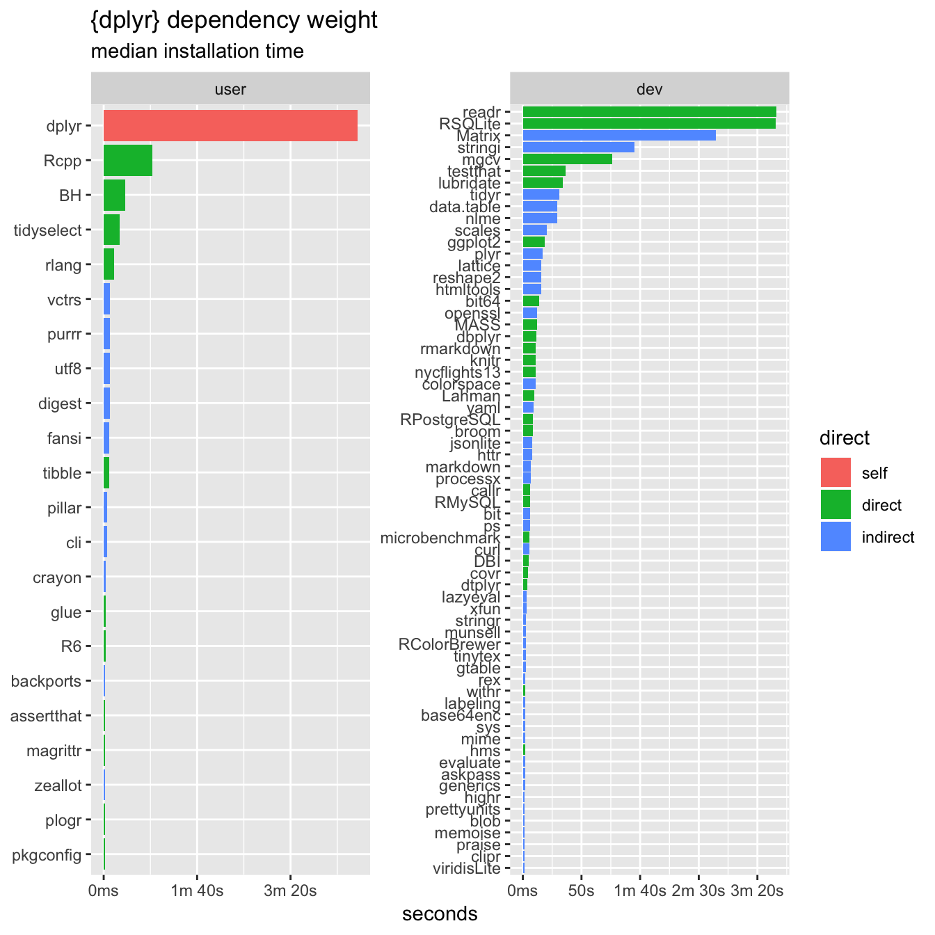 From the above plot we see that the installation time of dplyr for users is mostly due to compiling dplyr itself. However, for development dependencies, the readr, stringi and RSQLite packages also take significant time to install.