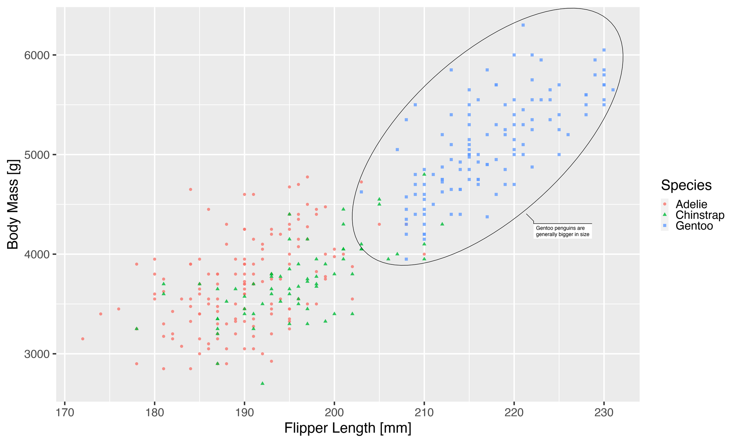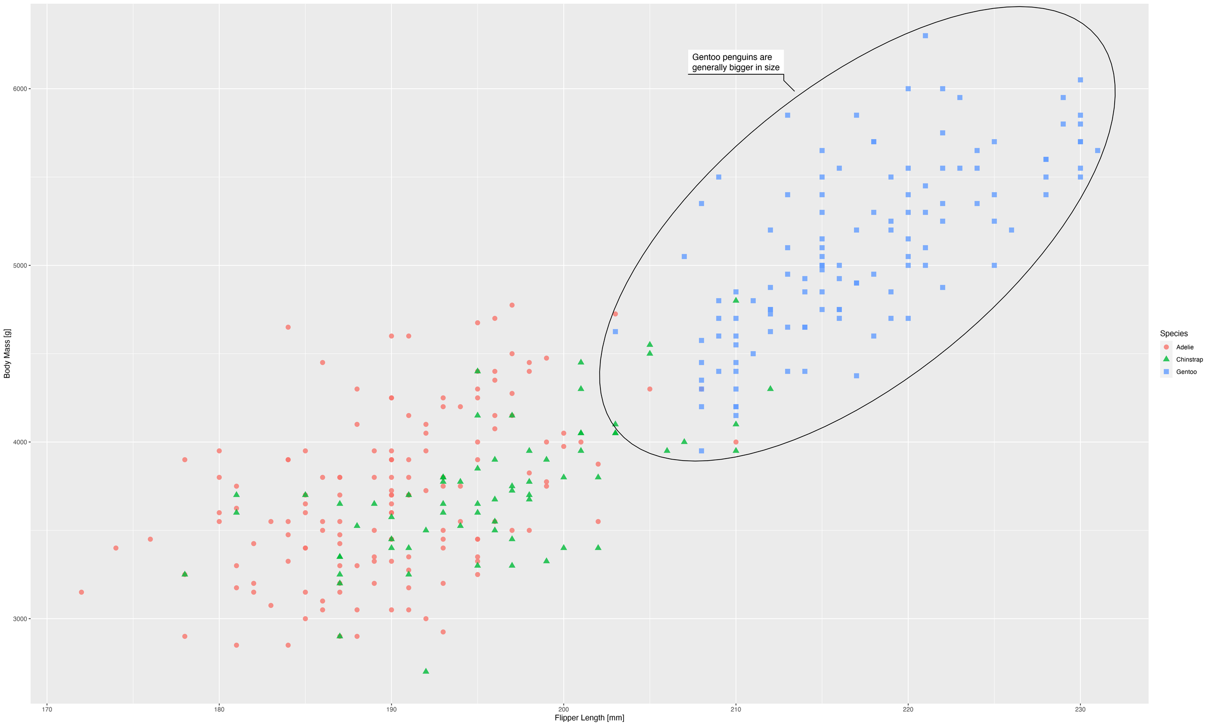 labs(x = "Flipper Length [mm]", y = "Body Mass [g]",  colour = "Species",