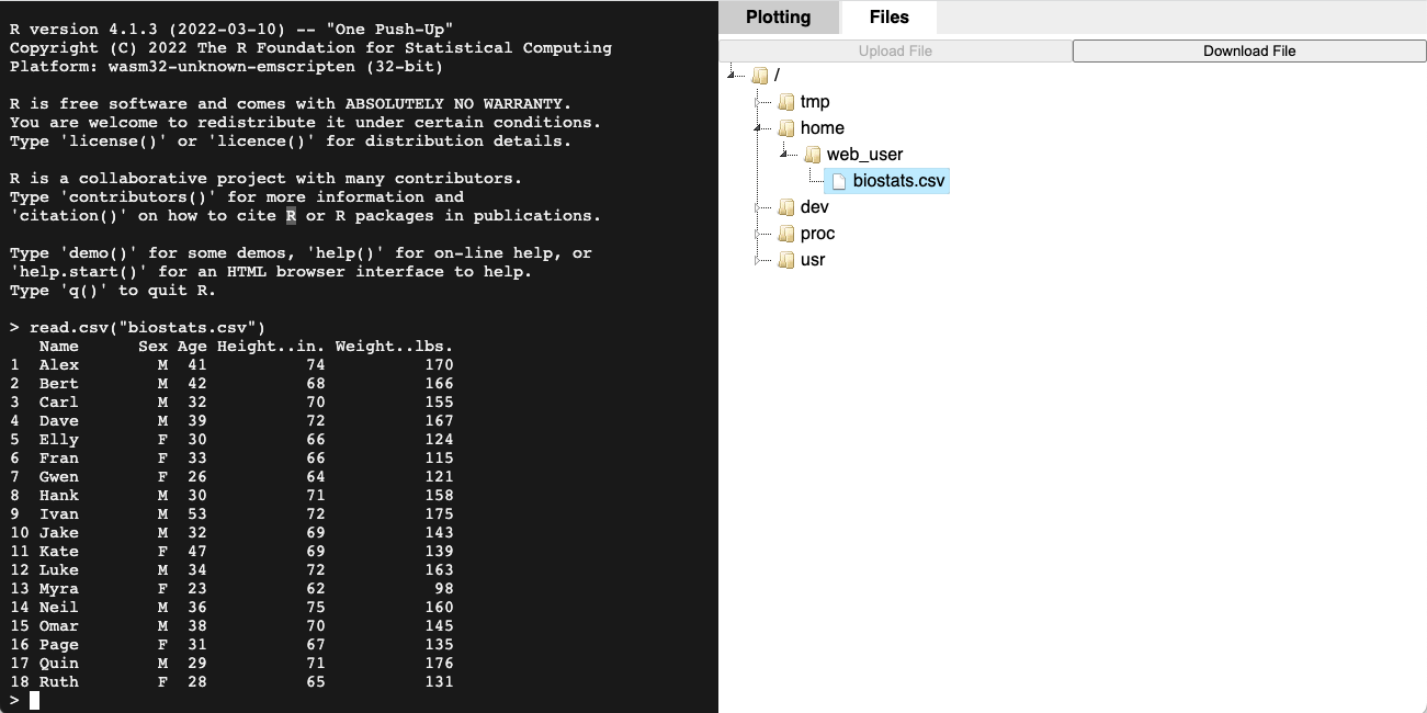 It’s possible to perform data analysis on reasonably large datasets by uploading data to a Virtual File System (VFS). The webR console provides an interface to view and interact with the VFS (Files tab, top right). Once a data file has been uploaded to the VFS it can be read by R like any standard file.