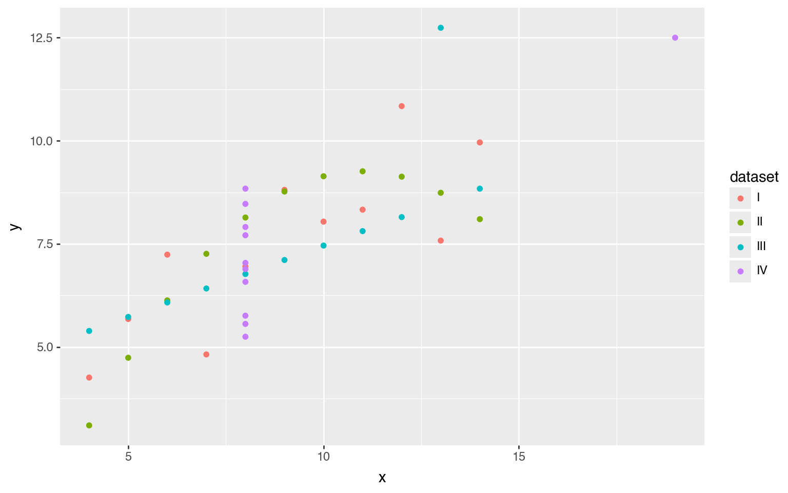 First, we turn the original four datasets into one Polars DataFrame. With 3 columns and 44 rows, the DataFrame is in long format, making it convenient for Polars to compute descriptive statistics and for Plotnine to visualize each row as a point. The column dataset indicates which rows belong to which dataset using the Roman numerals I through IV. (The Roman numerals are purely for visualization purposes.)